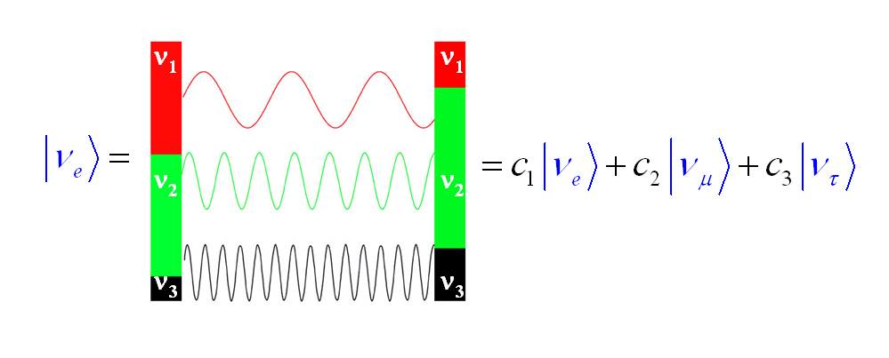中微子振荡示意图。一个电子中微子具有三种质量本征态成分,传播一段距离后变成电子中微子、μ中微子、τ中微子的叠加。