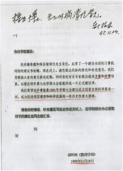 附件2:1993年11月郝柏林教授向学部提交了尽快开通国内计算机联网的建议,他还同时促进了我国互联网国际出口的建设。