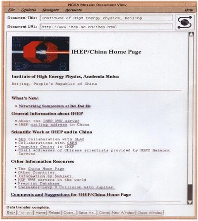 附件3:高能所于1994年4月设立了WWW服务器(中国第一台),附图是当年的网页(设计者是计算中心的女生樊岚)。这台服务器(486机器)现保留在中国电信博物馆。