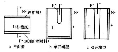 通常使用的半导体探测器主要有结型、面垒型、锂漂移型和高纯锗等几种类型(下图由左至右)。金硅面垒型探测器1958年首次出现,锂漂移型探测器60年代初研制成功,同轴型高纯锗(HPGe)探测器和高阻硅探测器等主要用于能量测量和时间的探测器陆续投入使用,半导体探测器得到迅速的发展和广泛应用。