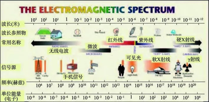 暗物质是天文学家观测宇宙时发现的一种“暗”的物质。所谓“暗”的物质是指没有观测到这种物质任何的电磁辐射。我们知道,天文学家观测宇宙所通过的媒介是不同波段的电磁波,如图1所示,根据波长的不同,电磁波从波长最长的无线电波、微波、红外线、可见光到波长比较短的紫外线、X射线和能量最高的γ射线。现代的天文观测仪器发展迅速,在各个波段都有非常强有力的观测仪器,然而,所有这些强大的天文仪器都没有观测到暗物质所发射的电磁辐射,故而被称作暗物质。