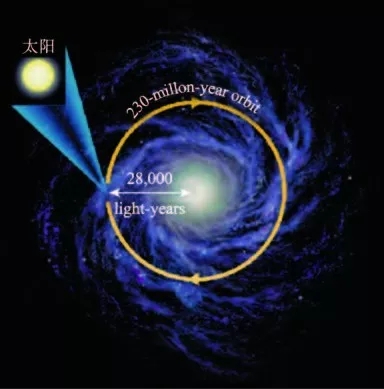 首先以太阳的运行为例。如图3所示,太阳到银河系中心的距离是2.8 万光年,而绕银河系中心旋转一周所需的时间是2.3亿年。我们知道,要把太阳固定在这样的圆周运动的轨道上所需向心力和物质提供的引力相等。通过简单的计算就可以得到,产生这样的向心力需要太阳轨道内包含大约1011 MSun(太阳质量)的物质,而可以观测到的恒星和气体的质量只有大约几倍的109 MSun。显然,还有更多的不可见的物质贡献了更强的引力,这个推断和当初推断天王星之外还存在着海王星的道理是一样的。如果不存在暗物质,那么向心吸引力就要弱很多,太阳的旋转速度也要相应小很多。