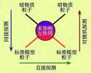 当前探测暗物质主要包括三类实验方案,如图6所示。要探测暗物质粒子就需要探测到暗物质粒子和普通粒子的相互作用,只有通过对探测信号的分析才能了解图6中“未知相互作用”是什么样的。这种相互作用体现在三个方向上,从下向上,就是通过把普通粒子加速到很高的能量对撞产生出暗物质粒子,这就是对撞机探测,比如在欧洲核子中心的大型强子对撞机(LHC)上进行的暗物质寻找就是这种探测方式。横向的方向表示一个暗物质粒子和普通粒子发生弹性散射,通过探测这种散射产生的信号寻找暗物质被称为暗物质的直接探测。从上向下的方向代表着两个暗物质粒子碰撞并湮灭而产生一对普通粒子,通过寻找这样的湮灭产物寻找暗物质粒子被称为暗物质的间接探测。