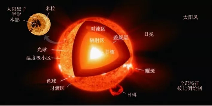 太阳如图2所示从内到外分为日核、辐射区、对流区、光球、色球、过渡区和日冕等层次。最内层的日核只占据太阳体积的1.56%,但是日核中进行的核聚变反应却是太阳发光发热的能量源头。值得一提的是,日核中的核聚变反应是非常温和的,因为日核的温度和密度还不够高,所以需要借助量子隧穿效应核聚变反应才可以发生,也就是说在一定时间内只有很小一部分比例的氢聚变成了氦。计算表明,单位时间单位体积的日核物质聚变产生的能量可能跟新鲜肥料堆差不多。因此太阳巨大的能量输出主要依赖于它巨大的体积,每秒日核里面都有6亿吨氢原子发生聚变,放出大量的高能γ光子和中微子。