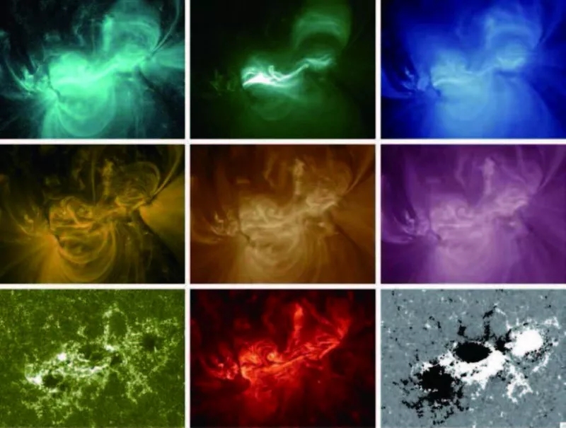 图3 太阳动力学天文台(SDO)卫星拍摄的太阳活动区在不同波段的图像,右下角的黑白图为纵向磁图,该图视场范围约20万千米