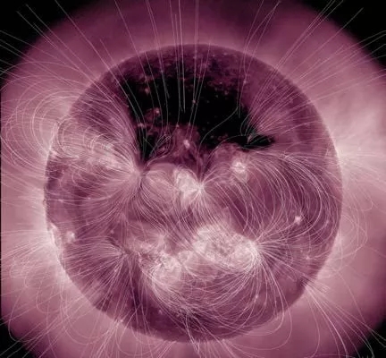 图7 SDO卫星观测到的一个位于太阳北极附近的巨大冕洞,白色是计算得到的日冕磁力线