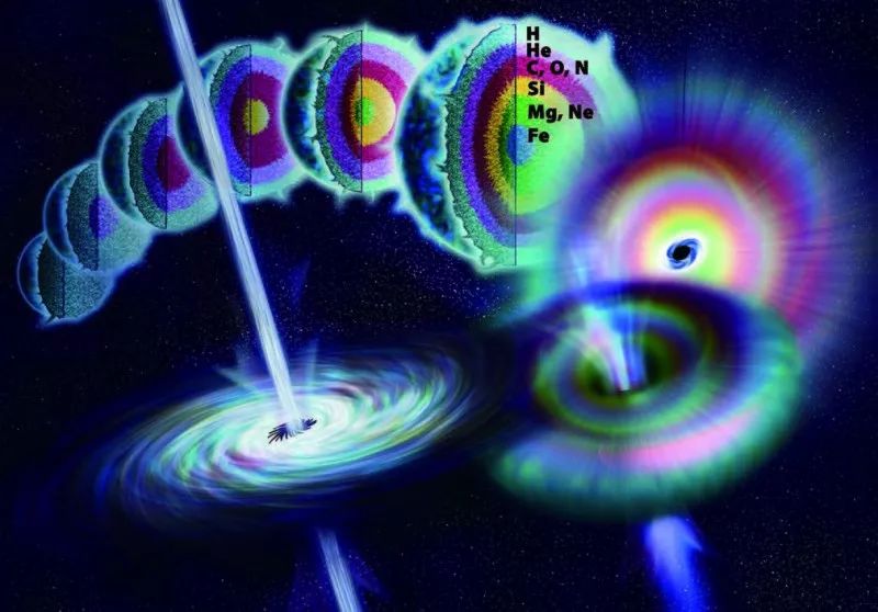 在塌缩过程中,释放引力能和黑洞的转动能,沿着黑洞的自转轴形成伽玛暴