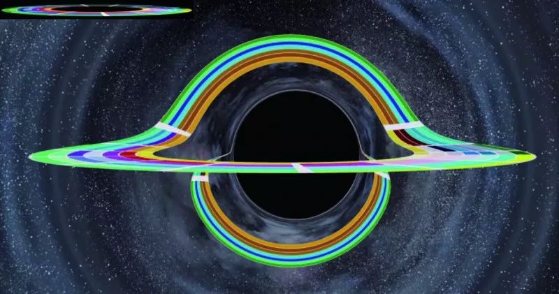 左上角小图显示的是吸积盘在平直时空中的图像。