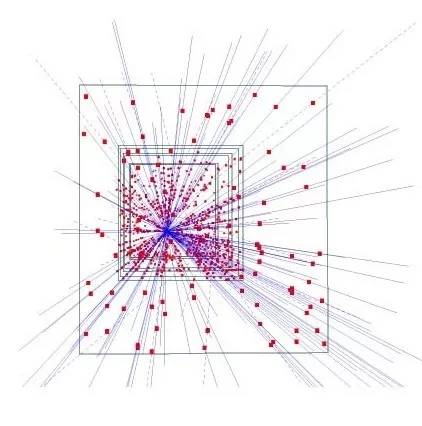 混合硅像素探测器1995年的照片,显示出153个高能粒子的轨道,展示了在高能物理中追踪应用的潜力(图片来自网络)