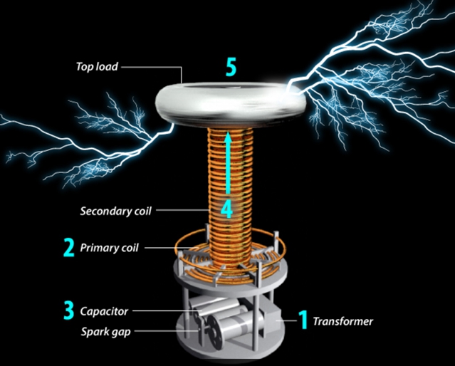 特斯拉线圈由一个谐振感应耦合的谐振电路组成。当初级线圈在最合适的时刻(相位同步)将能量传递给次级线圈时,能量传递和耦合的效率最高,在次级线圈中产生最高的电压,并击穿空气产生电弧。