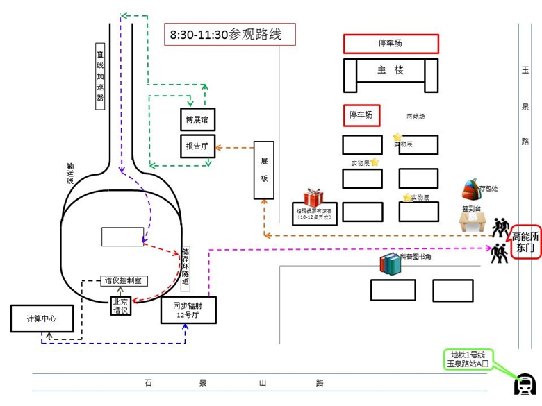 参观内容:高能所博展馆、直线加速器隧道、储存环隧道、北京谱仪及控制室、计算中心、北京同步辐射装置。其中直线加速器隧道、储存环隧道、北京谱仪于11:30停止进入。