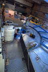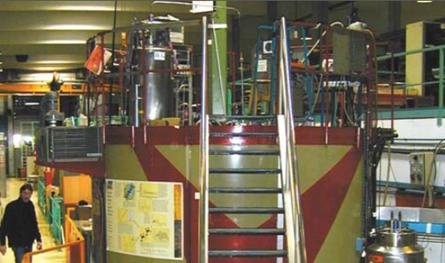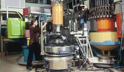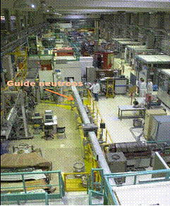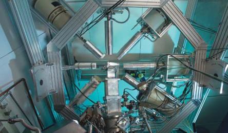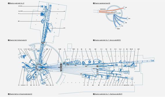 ILL的高通量核反应堆RHF(High-Flux Reactor)提供世界最高强度的中子源,拥有近40套先进的并不断升级改造的设备和仪器。它的核心部分是一个重水冷却型高浓缩铀燃料箱,核裂变产生的中子束强度达到1.5*1015 中子/厘米2/秒,热功率为58.3MW,速度2万公里/秒。它们在被重水冷却后可急速减速至2.2公里/秒,同时产生新一轮的裂变。RHF核心处设有3个装置,分别产生热中子(10公里/秒)、冷中子和超冷中子(700米/秒和10米/秒)。热中子源区的温度保持在2600。C,冷中子源形成一个含有20升-248。C液态氘区。冷中子通过和氘原子的不断碰撞,继续减速,科学家们根据需要通过单色仪和准直器选择光源,检测样品,以便认识各种形态的物质,发展新材料和开发新药品。