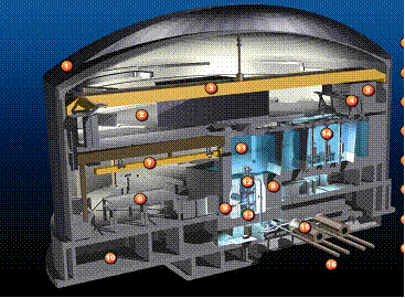 9.准直中子束出口;10.B层配套设施;11.清水池;12.重水冷却池;13.燃料;14.废料储存库;15.交换器;16.二次冷却