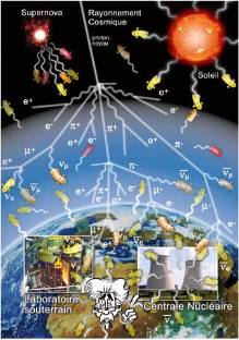 来自宇宙的粒子不分昼夜、持续不断地辐射到地球表面。它们与高层大气的原子核(氮,氧)相互作用,产生瀑布般的次级粒子流,包括π介子,k介子,μ子,电子,中微子等。