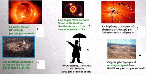 太阳也是中微子的发射源,来自太阳的核聚变反应;但中微子同样能够来源于地球本身,我们的周遭环境,比如核电站、各种物质的衰变等。有时,来自遥远的超新星、类星体和耀变体强烈的大爆炸也会产生中微子云团。