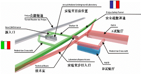 法国Modane地下实验室位于法国东部罗纳 — 阿尔卑斯大区(La région Rhône-Alpes)萨瓦省(La Savoie)的边境小镇Modane地下,简称LSM(Le Laboratoire Souterrain de Modane)。LSM深藏于阿尔卑斯山脉弗雷瑞斯山峰(Le Mont Fréjus)下1700m的岩石中,处于连接法国萨瓦省和意大利西北的皮埃蒙特(Piémont)大区的弗雷瑞斯交通公路隧道(Le Tunnel Routier de Fréjus)的正中央,离入口处约6.5公里。LSM地下实验室面积400m2,空间容积约3500m3。