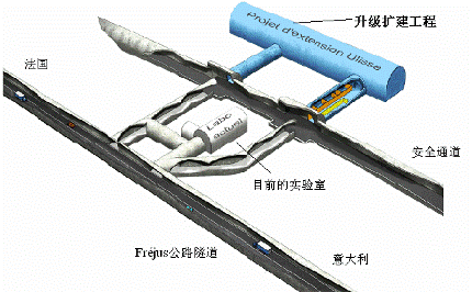 幸运地是:几乎在同时,这项科学需求与另一项社会需要又不谋而言。法国和意大利两国政府决定在Fréjus公路隧道附近,平行地建一条安全疏散通道。挖掘工程已于2009年秋天开工。Modane地下实验室抓住这唯一的机遇,为暗物质研究和中微子物理实验,以及地质、生物、工程科学研究开凿新的工作区域,扩建新实验室(下图蓝色区域),有效使用空间容积将达到6万m3,几乎相当于现在的20倍。这项大工程已于2008年12月作为先导项目,正式立项于法国国家重大科研设施线路图中(TGIR,Tres Grandes Infrastructures de Recherche)。实验室总体工程预计2013-2014年完成,并投入使用。