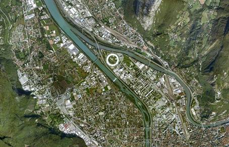 ESRF位于法国东南重要的科研和高技术工业城市格勒诺布尔(Grénoble)。该市是欧洲最高山脉阿尔卑斯山的“大门”,并有 “法国硅谷”之称。穿城而过的两条河流,伊泽尔河(Isère)和扎克河(Drac)在城西北郊汇合,ESRF就建在这两条河之间“半岛”的尖上。