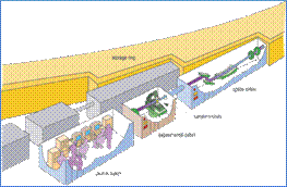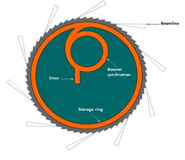 ESRF主要由注入器、增强器和储存环三大部分组成,被加速的电子束在储存环中经过磁结构谐振器的振荡,发出大量高精度的光,电子束能量60亿电子伏特(6 GeV)。