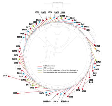 ESRF的40条束线可分为6组:结构生物学、X射线成像、聚合物结构、材料结构、电子结构和磁学、动力学和极端条件,分属于物理学(Group1- Group3)和生命科学(Group4- Group6)两大领域。