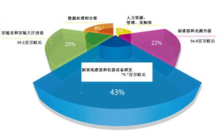 升级改造工程分两期。一期工程(2009-2015年)的经费已陆续调拨,除0.74亿欧元ESRF的改造经费外,19个成员国共同投资了1.04亿欧元。欧盟第七科技框架计划(FP7)也给予了财政支持,合约1.8亿欧元(约2.4亿美元)。经费配比如下:
