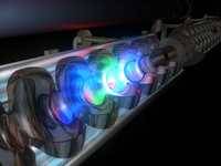 据此,简单地选择电子加速即可。为使这样的X射线激光器工作,需要极高质量的电子束流。几十亿的电子需要尽可能地具有相同的能量和方向。它们还需要组合成球型束团,直径不大于1/10厘米。TESLA超导直线加速器正好能够产生这种电子束流。(右图为波荡器)