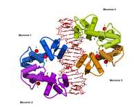 利用粒子加速器产生的强X射线,现在可以详细地分析生物分子结构。但是,为做到这一点,需要“生成”一种尽量多的分子组成的硬晶体 – 这种晶体通常溶于水。只有在晶体里,每个分子的信号才能相互加强,形成可用的图像。问题是这些信号的形成非常困难和复杂,约有一半相关的生物物质甚至不能生成晶体。(左图为蛋白质DNA 集合体)