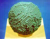12个五角形和20个六角形:古典的足球形状。用碳原子替代一块块皮子,形成“足球分子”,或“巴基球”,用科学术语来说,形成富勒烯。分子足球完全是一种非同寻常的碳,属于组团类,也就是由原子或分子组成的小块。它太小构不成晶体,簇团状态的物质具有完全新的常常出乎人们意料之外的特性。