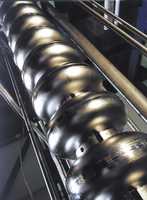 金属铌冷却到-2640 C(这种温度只在外部空间才有)后,便失去所有电阻,导电时不损耗任何能量。这种特性称为“超导”。由于超导,TESLA加速器中的粒子可被加速到所需要的对撞速度。TESLA工程的部分项目涉及开发超导铌加速节,即所谓的共振器,使其达到必需的能量。与TESLA有关的工作,经与工业部门的合作,在高频超导技术方面取得了重大进展。在地下TESLA隧道里,沿着整个加速器,通过将加速节冷却到-2710C使其成为超导加速节。(左图为在超净室中加工TESLA共振器)