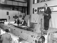 建造HERA是一个大型的国际合作,共有11个国家参加了建造,在粒子研究历史上属于首次。以前,在国际合作的框架下建造大型探测器很普遍,建造加速器本体则是本研究所自己的责任。但是,国际上对HERA的兴趣非常之大,法国、意大利、以色列、加拿大、荷兰和美国的研究所提供了装置的主要部件和为主要部件支付费用,或进行重要的测试。英国、波兰、捷克斯洛伐克、中国和前德意志民主共和国及德意志联邦共和国的研究所派专家协助工作。有不少于45个国外研究所和320家公司(合同金额超过25,000欧元)参加了这一工程的建造。HERA所须经费20%以上来自国外,HERA实验约60%的经费也来自国外。这种“HERA模式”的国际合作非常奏效,现在已成为大型国际研究项目的榜样。(右图为HERA研究运行开始仪式) |