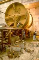 HERAKLES完成HERA南、西大厅之间的第一段隧道后,安装人员接手,先装电缆和水管,然后是照明和通风系统,接着是电子储存环的第一批磁铁。1978年8月,当HERAKLES再次到达起始点时,电子加速器将近一半已经安装完毕。一年之后,该加速器加速了第一个电子束流。然后是最关键的部件,即建造用新研制出来的超导磁铁及其复杂氦冷却系统的质子加速器。总的说来,德国和意大利的公司约向DESY交货650块超导磁铁。这些磁铁在磁铁测试大厅平均停留80小时,然后再安装在隧道中的电子环上。最后一块质子磁铁于1990年9 月19 日就位。1991年4 月14-15日夜,HERA组首次成功地将质子储存在机器里。1991年10月19日,HERA首次实现电子质子对撞。(右图为建造HERA) |