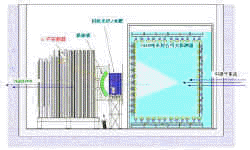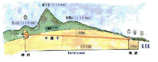 图中有K2K实验的一些重要方面。深黑色的箭头是250公里的通道,中微子从KEK穿过该通道到达超级神冈。绿色部分是“日本的阿尔卑斯山”,束流从其下部穿过。右边中间展开部分是模仿KEK实验室的地面,有束流靶区和前置探测器大厅。