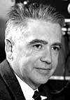 Melvin Calvin因“确立植物吸收二氧化碳时所涉及的化学反应顺序”获1961年诺贝尔化学奖。 与裂变钚的天崩地裂相比,绿色植物的能量转换过程似乎微不足道。但是,这个星球上的所有生命都取决于绿色植物将光能转化为化学能 - 光合作用过程的能力。每年,绿色植物从空气中的二氧化碳吸收约1500亿吨的碳和从水中吸收约250亿吨的氢,产生约4000亿吨的氧。估计植物利用它们吸收光能的效率最低为30%,最高可达100%。长期以来,科学家们一直认为,重复植物的成功将是达到结束长期食品和能源短缺而迈出的重要的一步。然而,首先必须准确地发现光合作用是如何进行的。 自1845年德国物理学家Julius Robert von Mayer 首次确定光合作用以来,了解光合作用的努力一直在进行。但直到二十世纪三十年代,科学家们真正知道的一切是,二氧化碳和水进入植物,出来氧气。三十年代末,使用放射性"示踪物"后,开始出现新的信息。示踪物为可探测到的元素,通常为放射性同位素,可作为有机分子的标记,和用来跟踪那些分子通过化学过程不同阶段的命运。早期使用的放射性示踪物"寿命"太短,不能揭开光合作用、特别是碳的关键轨迹的所有秘密。但是,1940发现了年半寿命为5000年的碳14。 日本投降的那天,LBNL所长Ernest Lawrence告诉他的同事生物化学家Melvin Calvin说,"现在是利用放射性碳做一些有用事情的时候了。"从该辐射实验室抽人组成一组研究人员,Calvin专攻光合作用问题。利用碳14示踪物,他和他的小组绘制了植物在光合作用中,从吸收大气中的二氧化碳到转化成为碳水化合物和其他有机化合物所走的整个路程。在绘制这样一个图的过程中,Calvin和他的小组还表明:阳光作用在植物中的叶绿素上,为制造有机化合物提供燃料,而不是像以前人们认为的阳光作用在二氧化碳上。叶绿素利用辐射能将水分子分裂为氢和氧。分开后,氢和氧含有的化学能比它们组合成水时更多。 Calvin因破解光合作用过程而获诺贝尔化学奖。他继续致力于建立LBNL的生物动力学部,他领导该部长达20年。1980年他退休后,加州大学校园内这个独特的圆环形(该部科学家工作的三层实验室)被重新命名为Melvin Calvin实验室。