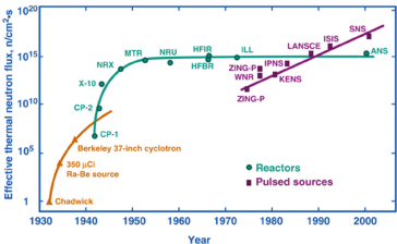 上图显示出反应堆和脉冲中子源性能的演变。近年来,加速器技术的迅速改进使设计和建造非常强的中子脉冲源成为可能。