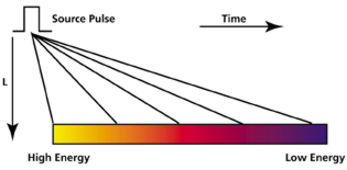 每个脉冲都有各种波长和能量的中子;最高能量的中子波长最短,对低能量的中子波长最长。因为热中子运行缓慢,所以在短距离内可以对它们的进展精确地定时。每个脉冲里都包括所有能量的中子,所以通过让它们向前走几米的短路,就能将不同能量的中子分开。高能中子在中能中子之前到达样品,最低能量的中子到达样品的时间用的最长。因为中子的能量按时间分布,所以单个中子的能量容易由飞行到样品的时间来加以确定。因为所有能量的热中子可用于散射实验,所以飞行时间技术能够为到达样品的每个源脉冲收集许多数据点。另外不像连续中子源通常的情况那样,在实验中不需要中子探测器移动,从而易于在样品周围放置大型探测器阵列或多个探测器。