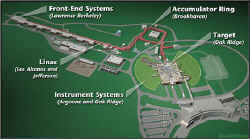 SNS是个合作项目,美国能源部所属6个实验室(阿贡国家实验室、布鲁克海文国家实验室、托马斯杰斐逊国家实验室、劳伦斯伯克力国家实验室、洛斯阿拉莫斯国家实验室和橡树岭国家实验室)参与设计和建造世界上功率最大的用于中子散射研究与开发的散裂中子源。初步设计要求加速器系统由一个离子源、一台全能量直线加速器(直线加速器)和一台累积环组成。三者合在一起产生短的强大质子脉冲。这些质子脉冲撞击一个水银靶,通过散裂核反应过程产生中子。SNS将1.4 MW的束流功率发送到靶。设计时,还为将来增加科学成果留有余地。这一思路旨在提供一台进入下一世纪足以满足科学界对中子流强要求的装置。
