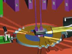 从靶出来的中子必须变成适用于研究的低能中子–就是说,它们必须减速到室温或更低点。从靶来的中子通过装满水的管(产生室温中子),或通过温度20K的液氢容器(产生冷中子)减速。这些减速剂位于靶的上部和下部。冷中子特别有助于研究聚合物和蛋白质。左图为SNS靶区—下部减速剂正视图。