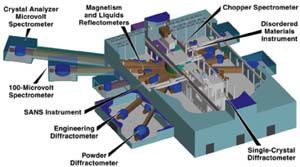 阿贡国家实验室(ANL)主要负责为SNS开发中子散射仪器,并与ORNL密切合作开发实验设备。SNS开始时有一个靶站,工作频率为60 Hz。将用两个“热”减速剂和两个“冷”减速剂为8条光束线服务,在这些光束线上将建造各种仪器。SNS期待每年有来自科学和工业界的1000 – 2000个用户使用其实验设备。因为不是所有这些用户都是中子散射方面的专家,所以SNS将提供科学家和技术员维护和运行这些仪器,并同用户界密切合作。右图为SNS上的仪器示意图.最终使用的仪器由用户界通过SNS仪器监督委员会确定。