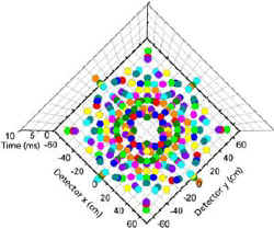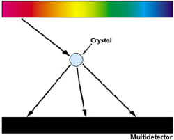 SNS的仪器如中子谱仪将用来确定晶体、陶瓷、超导体和蛋白质中原子的位置和排列。中子谱仪是如何工作的呢?由散裂中子源产生的中子脉冲沿着飞行轨道到样品。由于中子有各种能量和波长,所以它们按时间分布,给出一个到样品的连续谱。左图为通过让中子源的中子全谱从一个晶体散射进入到对位置敏感的多个探测器获得原子结构。当晶体中原子之间的距离与入射的中子的波长匹配时,那个中子就散射进入记录散射中子位置(散射角度)和到达时间的多个探测器中。结果是个峰值图,显示各种数量的中子到达多个探测器中每点的不同位置和到达时间。这一图形告诉科学家不同原子在晶体中是如何排列的。以相同原理为基础的仪器可以用来确定玻璃和复杂流体的原子结构,或工业部件中的残余应力。测量非弹性散射的仪器需要测量中子跨越往返样品路线的时间。用这种方法,仪器可以确定重要材料的激发谱和使原子保持在一定位置的力。飞行时间技术使为每个中子脉冲搜集大量数据点成为可能。测量中子时间飞行仪器的效率和产生流强不断提高以加速器为基础的散裂中子源的能力,将来可以不断提供改进的中子源。右图为 从多个探测器在时间和空间上为高温超导体YBa2Cu3O7获得的图像。从此图像中可获得原子的位置。