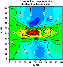 右图:中子散射图上标记显示的带有焊接覆盖层钢板上的压缩应变(兰色)和拉伸应变(红色)的极值。不该有的焊接工艺变量造成应变分布的不规则性。