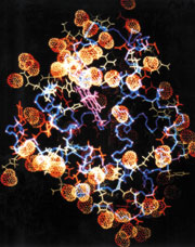 蛋白质是一串氨基酸,其序列由指导它合成的基因最后决定的。人类基因组排序工程将为在大约100,000酶、荷尔蒙和人的生命结构蛋白质编码的基因中化学碱基顺序提供完整的DNA蓝图。该工程下个阶段是识别和研究大分子,确定它们的形成和功能。衰老和癌症部分原因是由于涉及调节人的遗传图形表达式的DNA 和蛋白质功能异常引起的。知道了这些大分子的单个结构,可以帮助了解疾病在分子水平的化学性质和遗传调节的化学机制。左图:DNA的组成部分指导蛋白质的合成,其形状和结构由散裂中子源的中子散射决定。