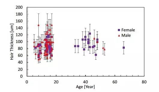 图2:头发直径与实验参与者年龄、性别的关系。红色三角代表男性被测结果,紫色方块代表女性被测结果。X轴代表实验参与者的年龄。图中有两团和年龄有关的分离数据。图2左侧第一团数据,代表着学生的数据,他们其中最大的年龄为18岁(只有一个19岁的实验参与者)。