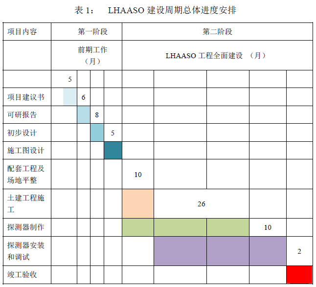 LHAASO项目的前期工作的进度拟为2年,其中:《项目建议书》文件的编制及审批5个月;《可行性研究报告》文件的编制及审批6个月;《初步设计文件》的编制及审批8个月;《施工图设计》及审查5个月。