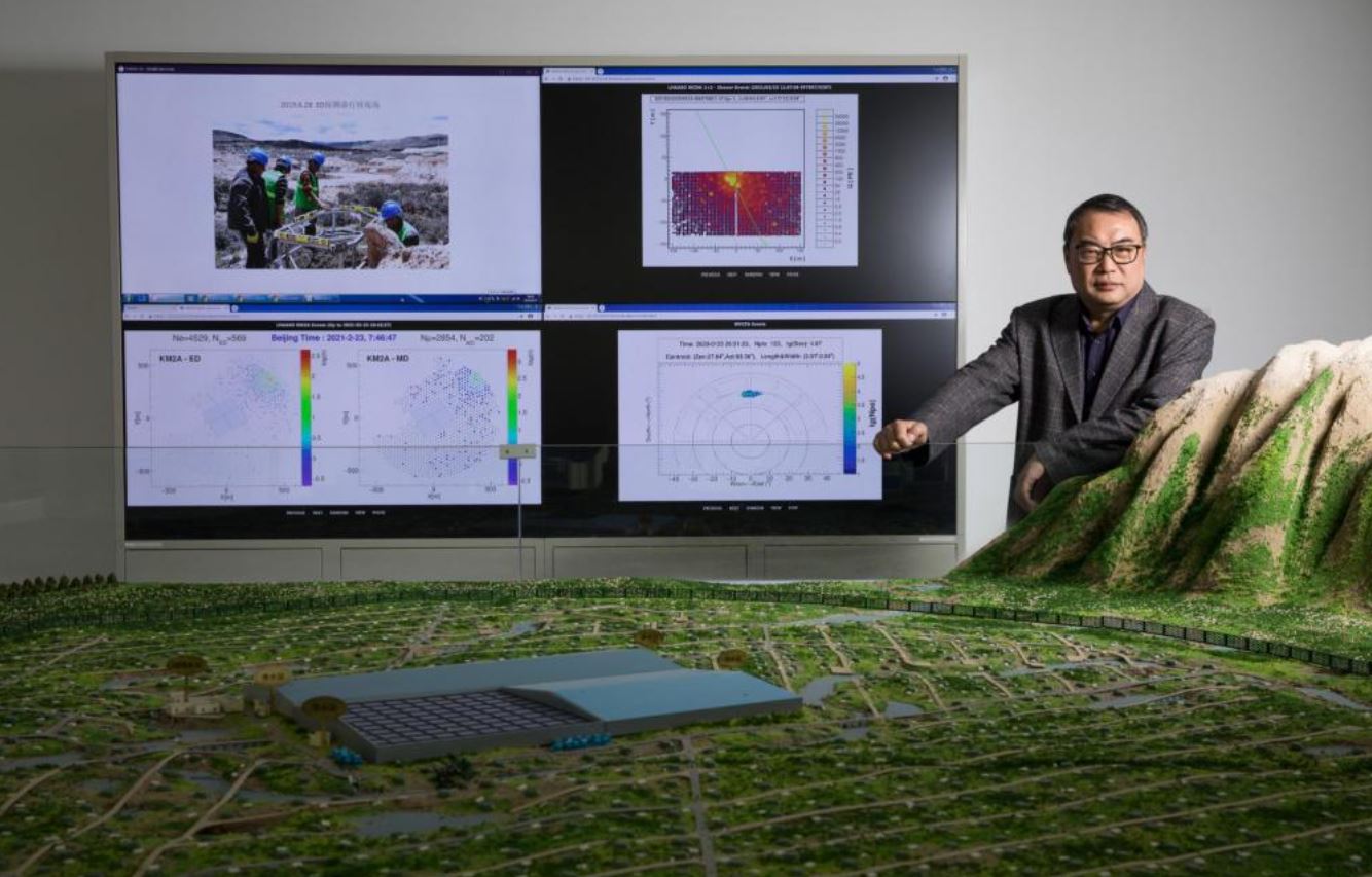 快盈v3研究员、拉索项目首席科学家曹臻展示拉索沙盘。中科院高能所供图
