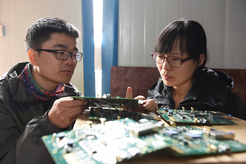 李骢(左)和同事在海子山上检查缪子探测器电子学板。