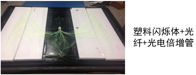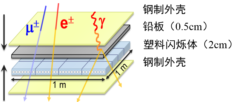 ED:用于测量EAS中的次级电磁粒子。探测介质为塑料闪烁体,通过波长位移光纤收集带电粒子在闪烁体内产生的闪烁光,并传导到光电倍增管(PMT),转换为电信号进行测量。