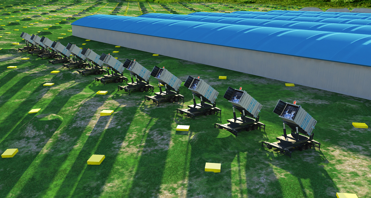 KM2A设计为中心区半径575m 的地面粒子阵列,5216个电磁粒子探测器(ED)以间距15m呈品字形均匀排列,1188个缪子探测器(MD)以间距30m呈品字形均匀排布于阵列中;外围区是一个半径处于575m-635m之间的环形区域,以间距30m共排布294个ED。下面效果图中:遍布整个阵列的ED如图中小黄色方块所示,而MD如图中的绿色凸起所示。