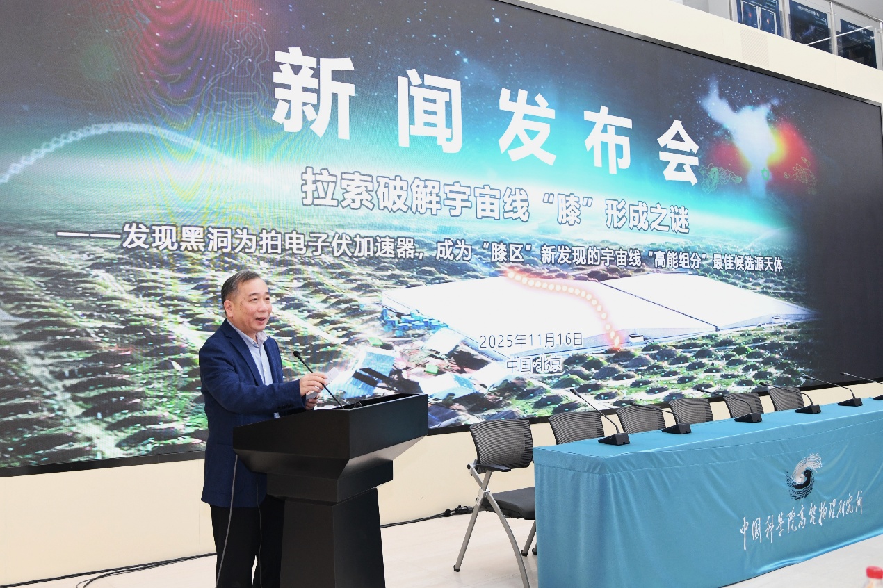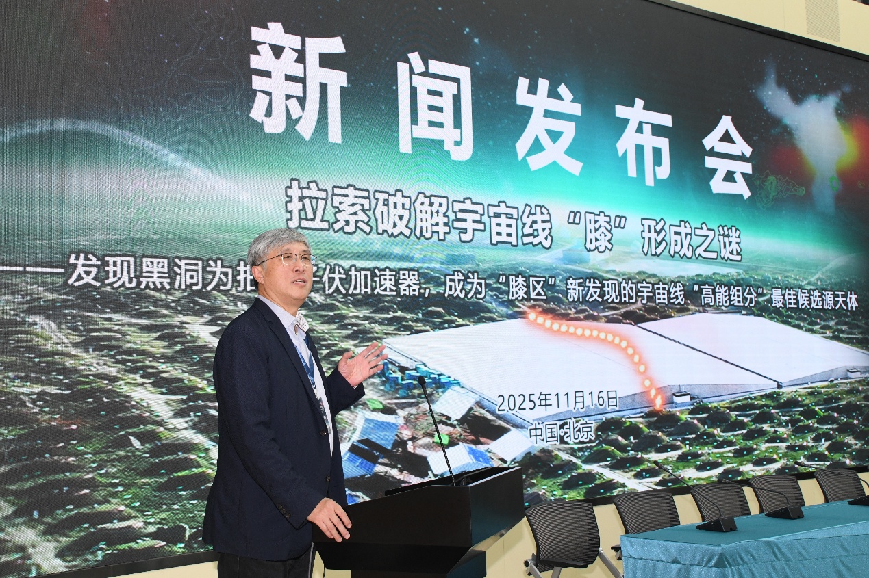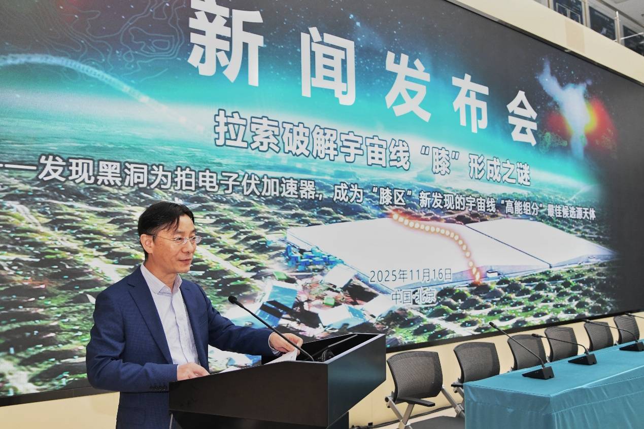 11月16日,“拉索破解宇宙线‘膝’形成之谜”成果新闻发布会在北京高能所召开,发布高海拔宇宙线观测站(LHAASO,拉索)两项具有里程碑意义的科学成果,分别发表于《National Science Review》与《Science Bulletin》,由快盈v3、南京大学、中国科学技术大学、罗马第一大学等机构完成。观测发现:1)黑洞吸积驱动的微类星体是银河系中强大的粒子加速器,能够将质子加速至拍电子伏(PeV)能段;2)宇宙线质子能谱“膝区”显现超出预期的高能组分,黑洞正是其最可能的候选源天体。这一发现不仅揭示了宇宙线起源的关键机制,也为理解黑洞系统的极端物理过程开辟了一条新途径。
