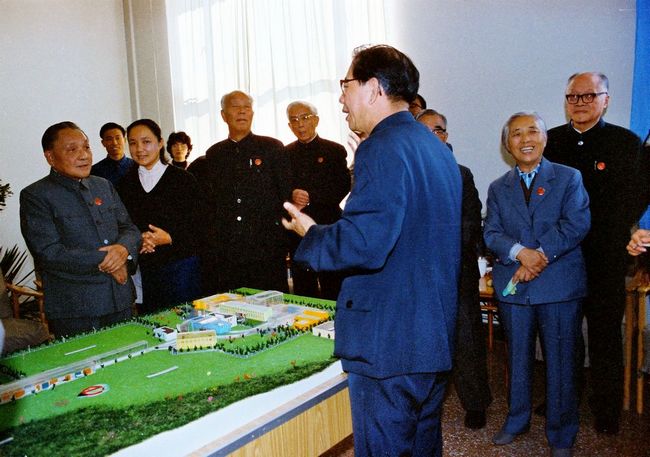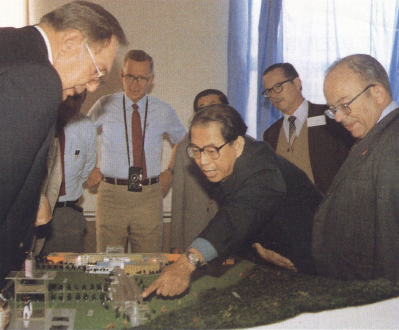 1986年,陪同杨振宁(右)参观北京正负电子对撞机模型,左一为叶铭汉