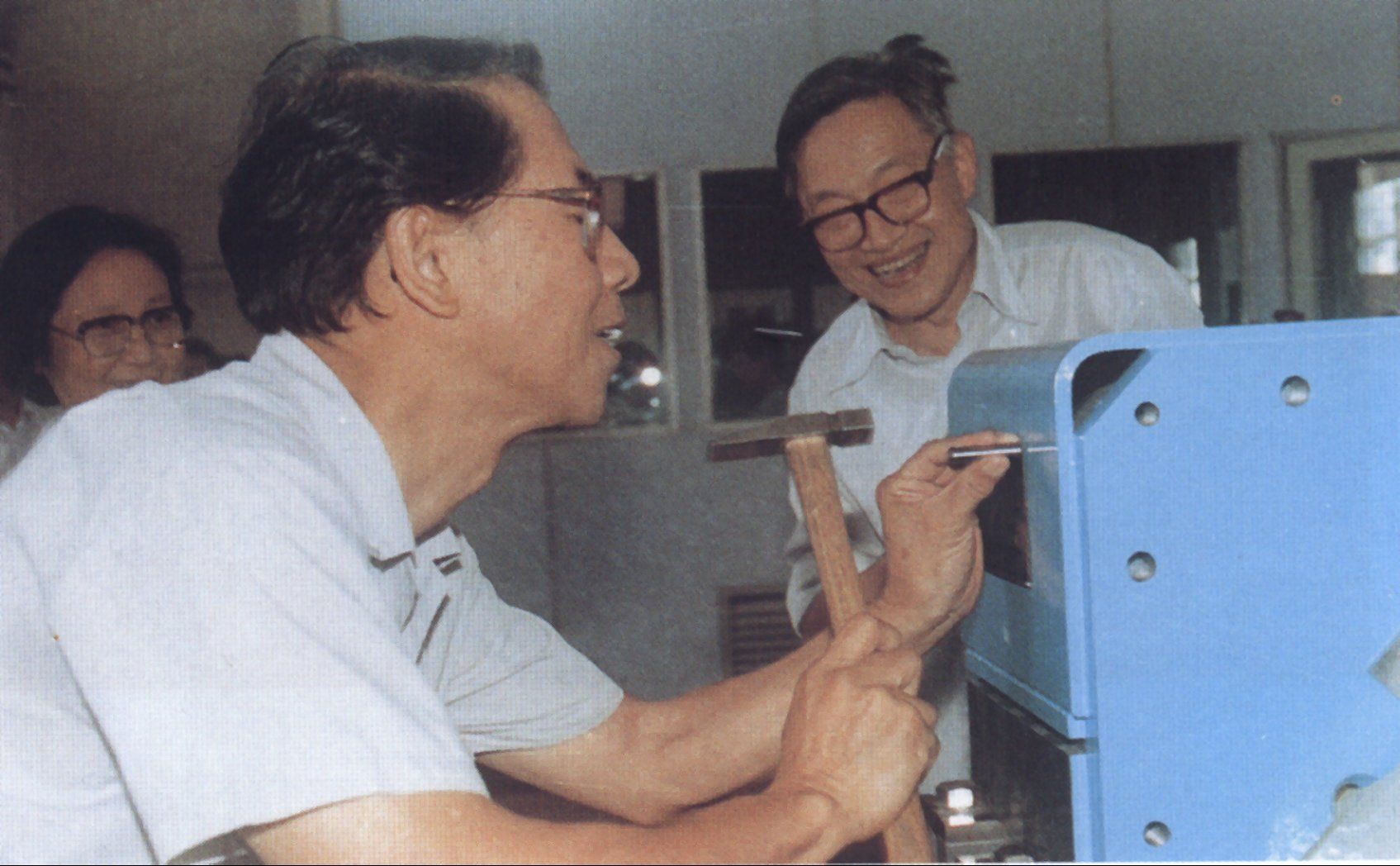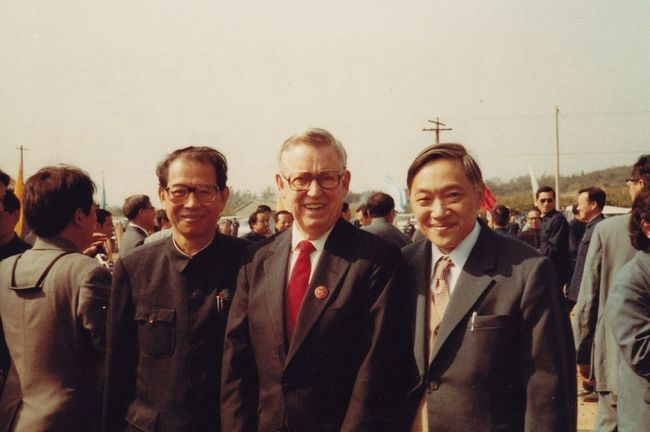 1984年,北京正负电子对撞机奠基典礼上,与叶铭汉(右)、美国能源部法勒(中)合影